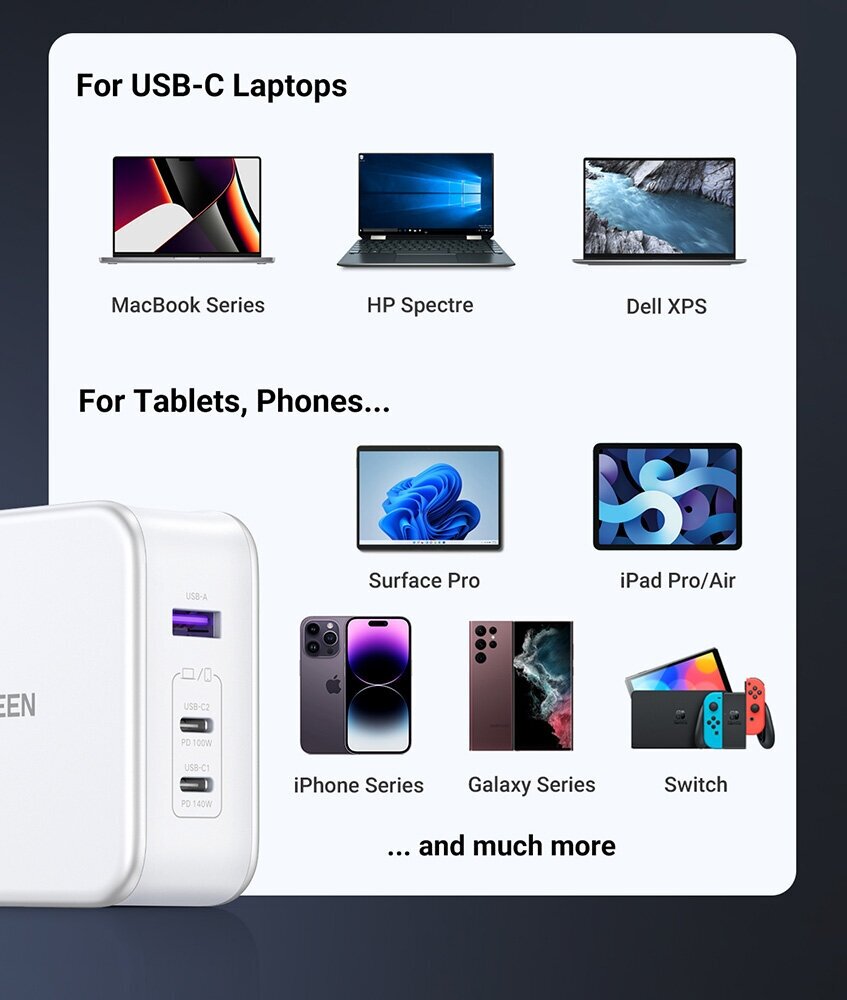 Зарядки для гаджетов Зарядное устройство UGREEN CD289 (15339) USB-A+2*USB-C 140W с кабелем USB-C к USB-C 2 м