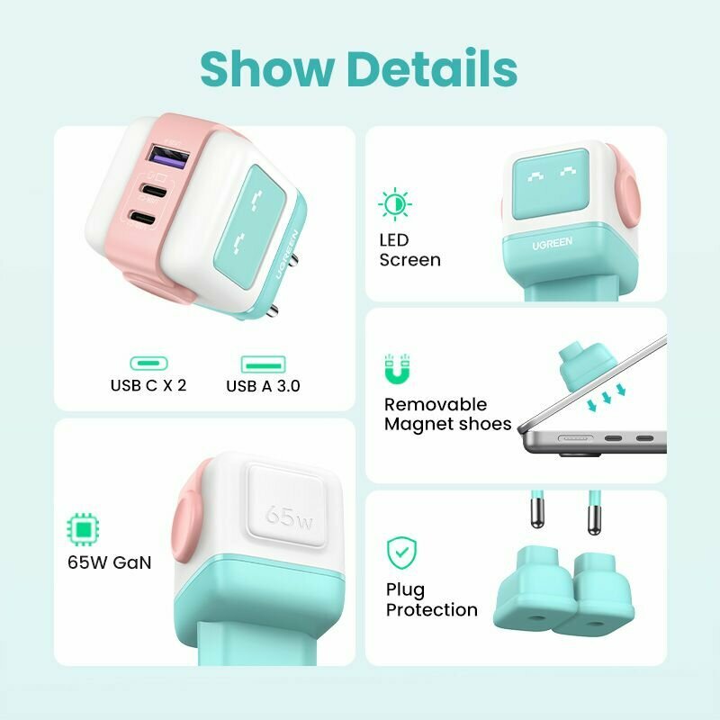 Сетевое зарядное устройство Ugreen CD361 65W Nexode Robot 2xUSB-C, 1xUSB-A GaN, RU(EAC), розовый/голубой 4 900 ₽ Подробнее
