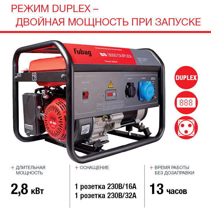 Бензиновый генератор Fubag BS 3500 Duplex объем двигателя 212 см³,