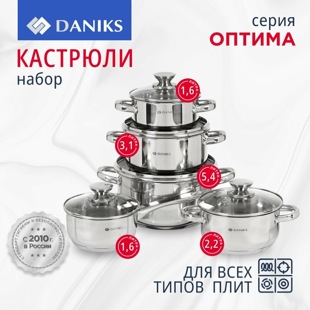 Набор посуды нержавеющая сталь, 10 предметов, кастрюли 1.5, 2.2, 3.1, 5.4 л, ковш 1.5 л, индукция, Daniks, Оптима 7 462 ₽ Подробнее