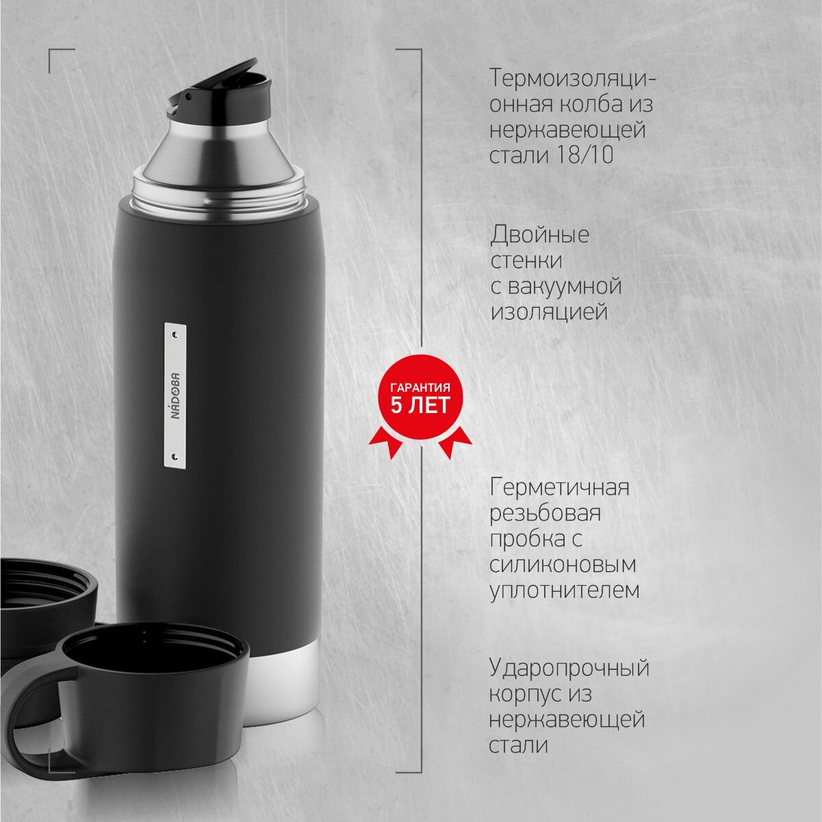 Термос NADOBA с 2 чашками, черный, 1 л (735011)