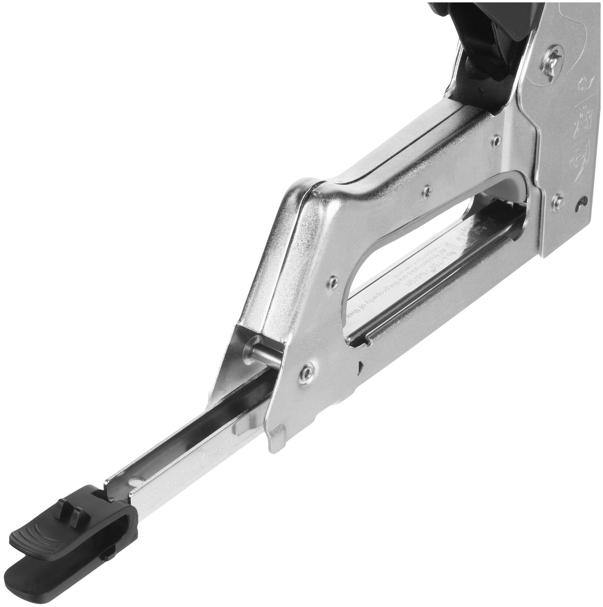 Лучшие цены. Неразборный корпус из прочных стальных деталей, с рессорным механизмом. Металлическая рукоятка с двухкомпонентным резино-пластиковым покрытием, имеет предохранитель для удобства и безопасности пользователя. Оснащен удобными механизмами для быстрой замены скоб и для легкого нажима рукоятки при забивании скобы. В корпусе имеется окошко-индикатор для контроля остатка скоб. Производитель гарантирует минимум 100 000 ударов механизма. Магазины в вашем городе.