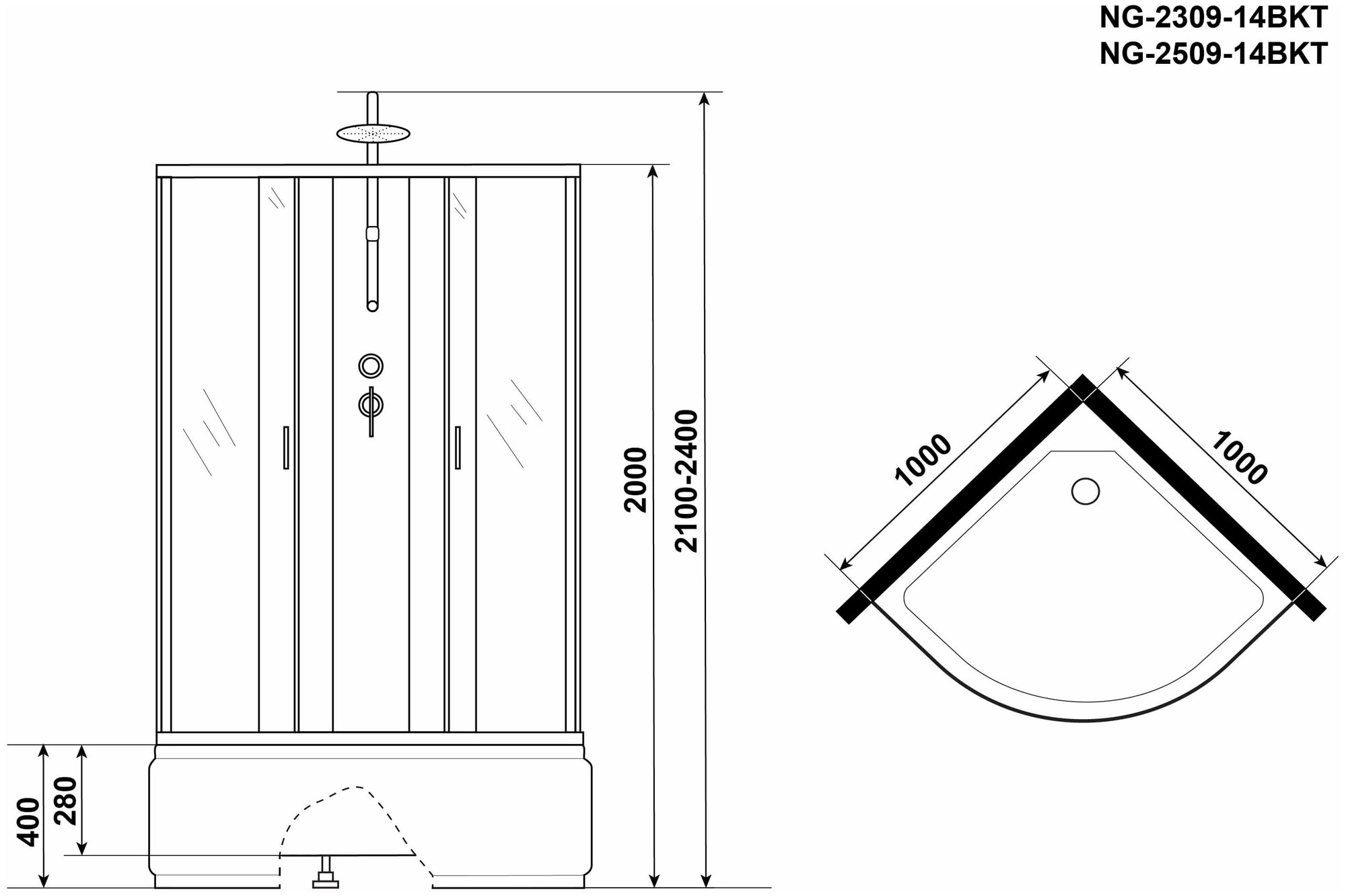 Душевая кабина ng-6709-14bk (1000х1000х2150) высокий поддон(45см) стекло прозрачное черные профиля