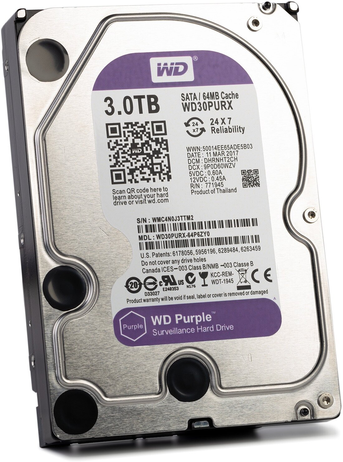 Жесткий диск 3.5" WESTERN DIGITAL WD Purple 3 ТБ, SATA III, 64 Mb, 5400 rpm (WD30PURX)