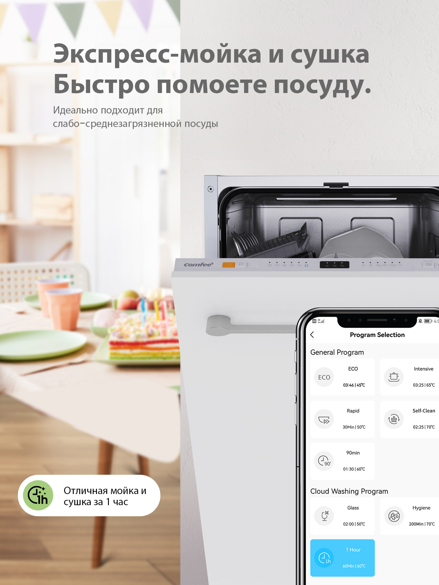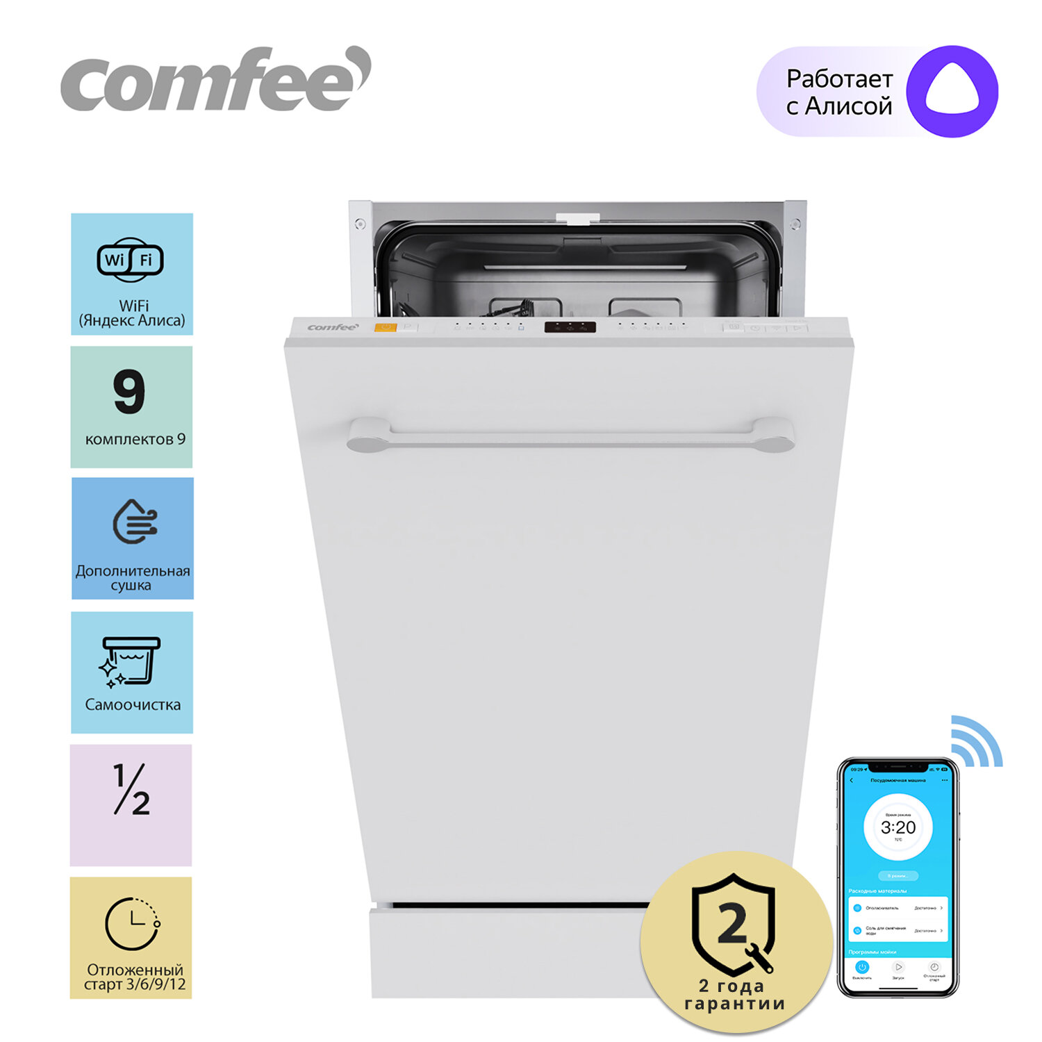 Встраиваемые посудомоечные машины Встраиваемая посудомоечная машина Comfee CDWI452i, Wi-Fi управление, ширина 45 см, 6 программ, самоочистка, отложенный старт, экспресс-мойка и сушка