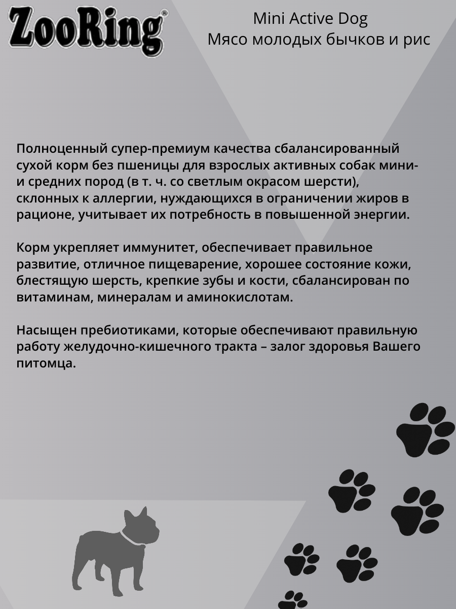 Корм для собак ZooRing Mini Active Dog Мясо молодых бычков и рис (без пшеницы) 700 гр