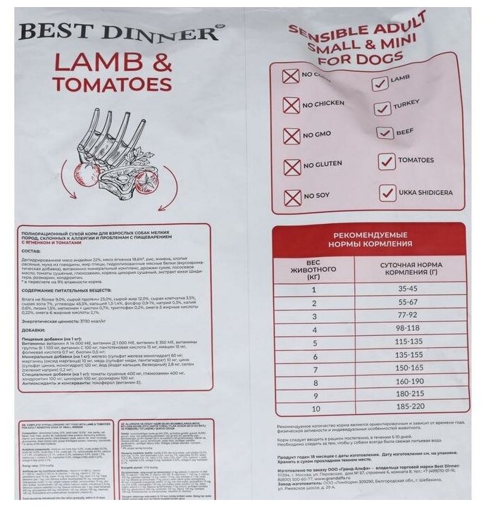 Сухой корм для собак Best Dinner при чувствительном пищеварении, ягненок, с томатами 3 кг (для мелких пород)