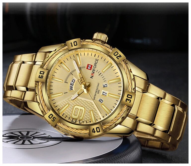 Наручные часы Часы наручные мужские кварцевые Naviforce металлические, круглые, золотистые
