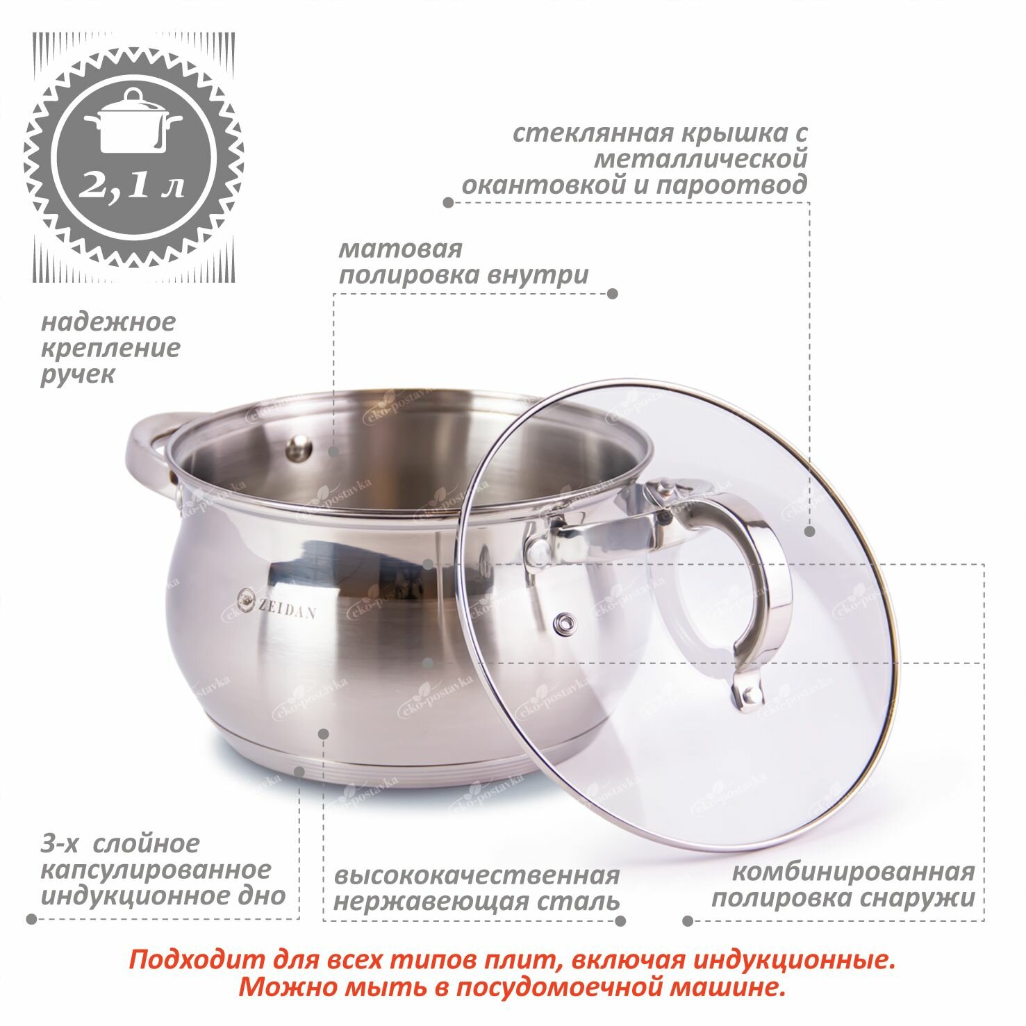 Кастрюля Кастрюля из нержавеющей стали с крышкой Zeidan 2 л для газовых электрических и индукционных плит