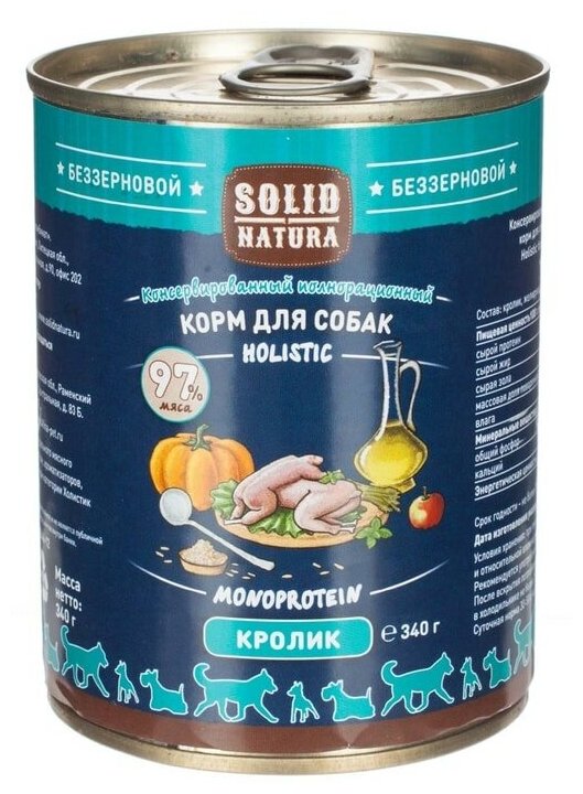 Влажный корм для собак Solid Natura Holistic, беззерновой, кролик 12 шт. х 340 г