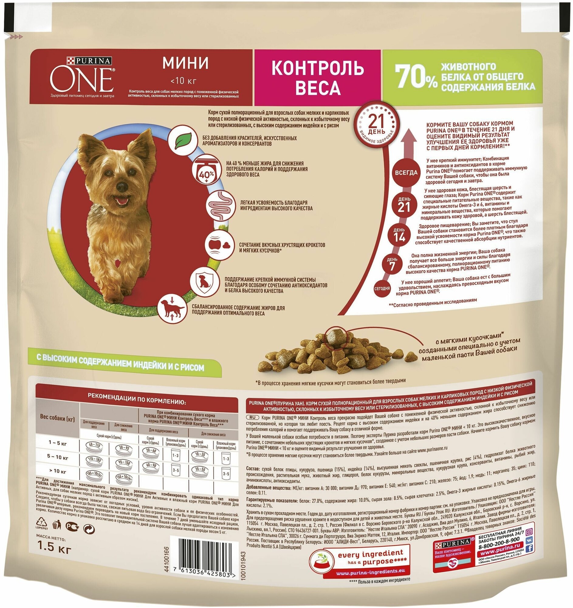 PURINA ONE мини здоровый ВЕС для взрослых собак маленьких пород с индейкой и рисом (1,5 кг)