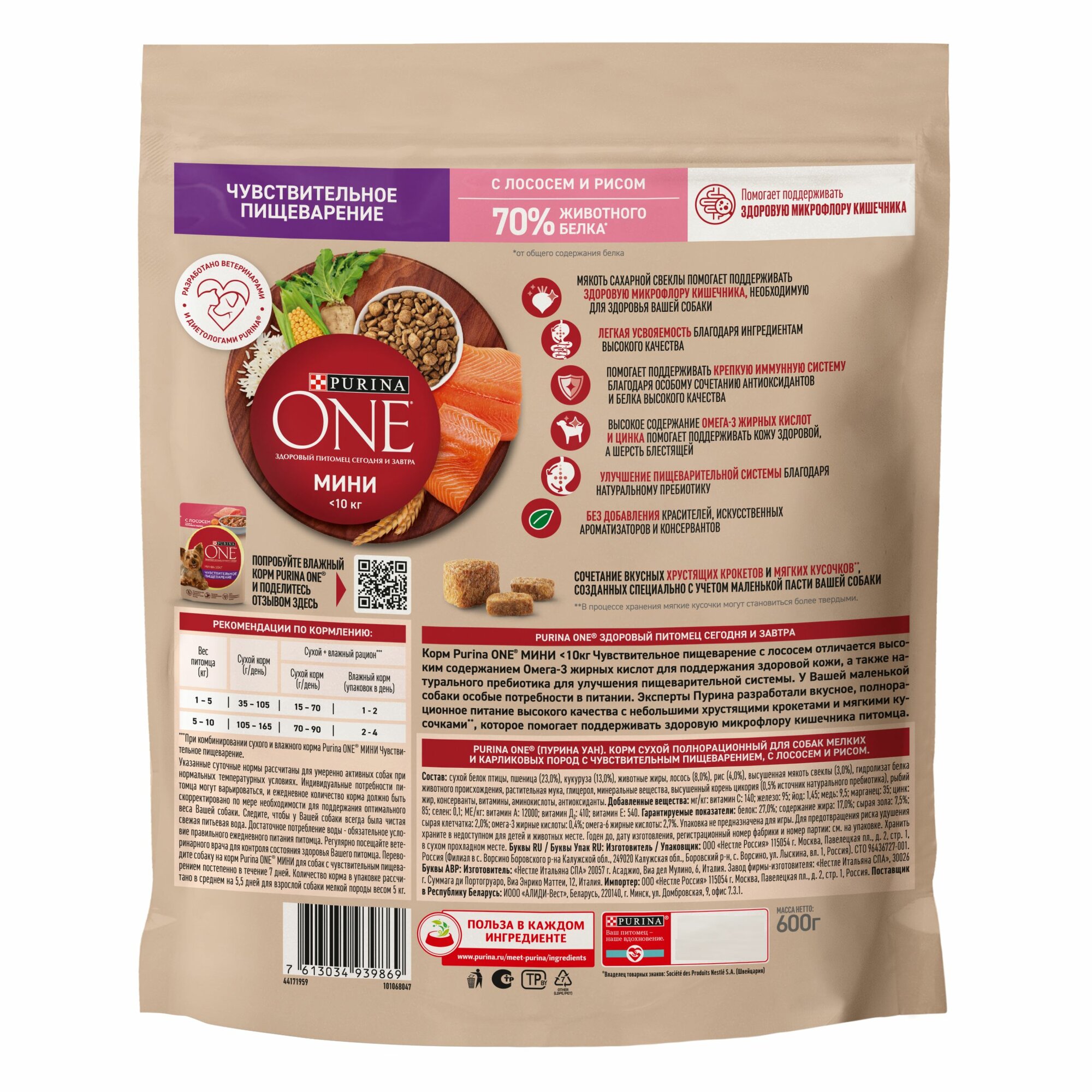 PURINA ONE мини чувствительная для взрослых собак маленьких пород с чувствительным пищеварением с лососем и рисом (0,6 кг)