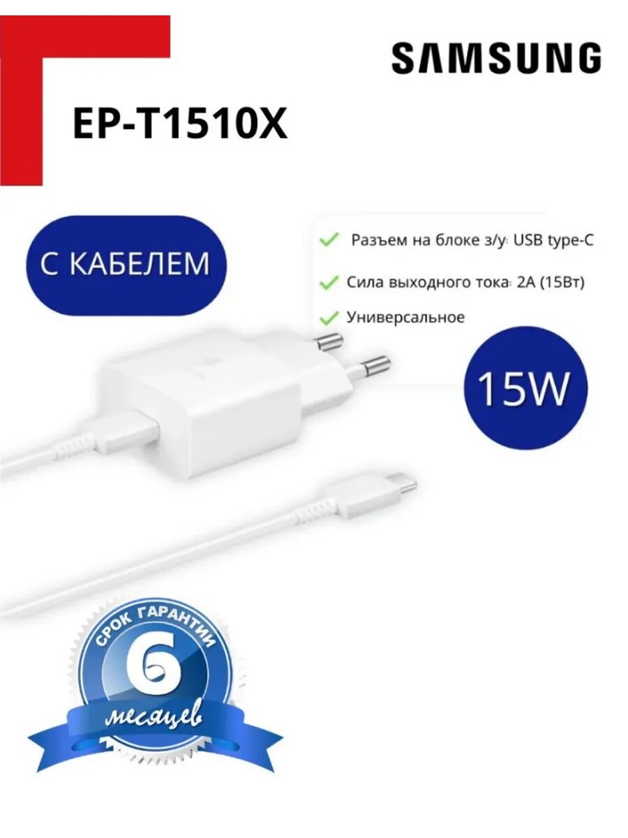 Сетевое зарядное устройство Samsung EP-T1510, USB Type-C, 15 Вт, с функцией быстрой зарядки, кабель USB-C, черный