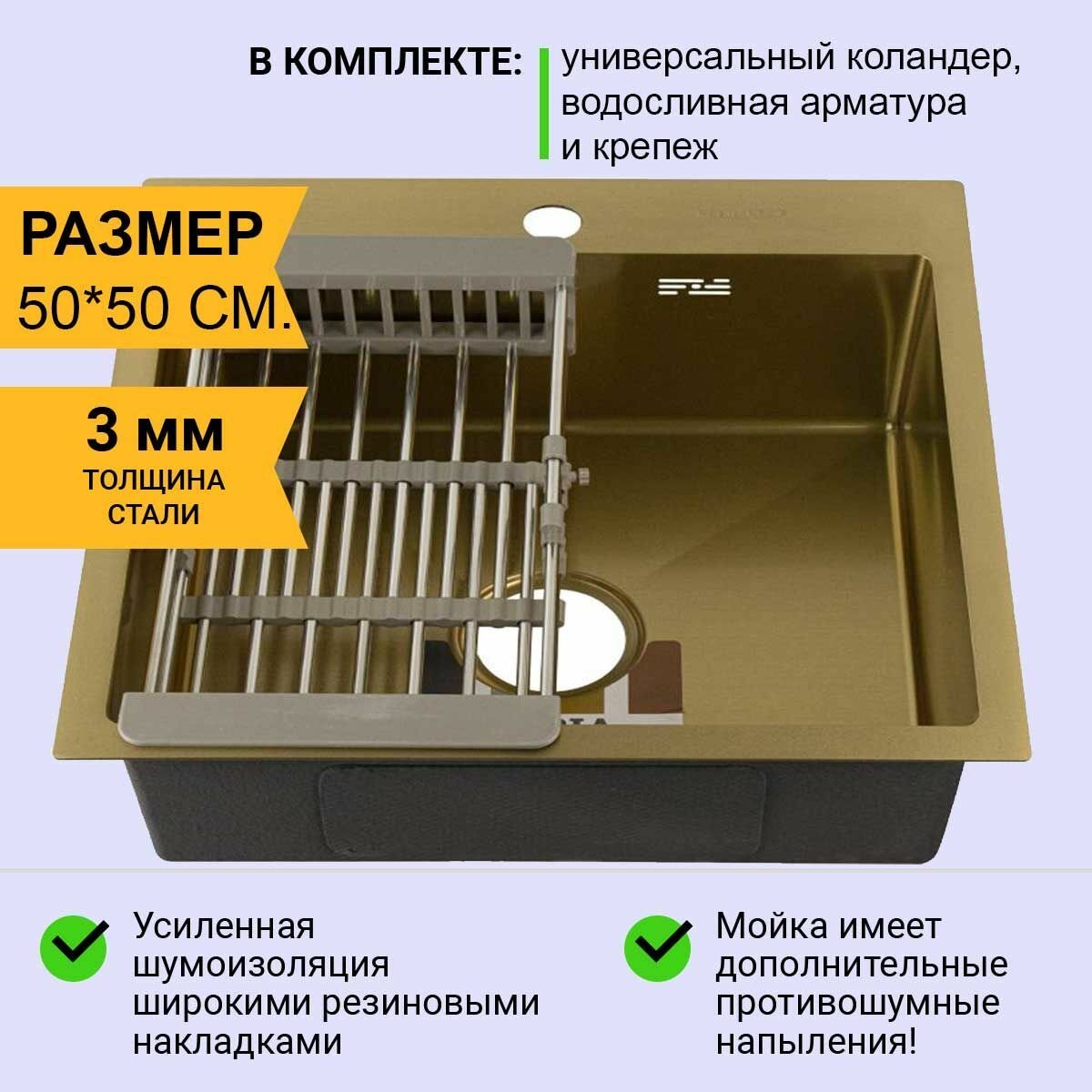 Кухонные мойки Мойка нержавеющая врезная 50х50 золото FABIA Profi (3.0х200) выпуск 3 1/2 с сифоном, с коландером