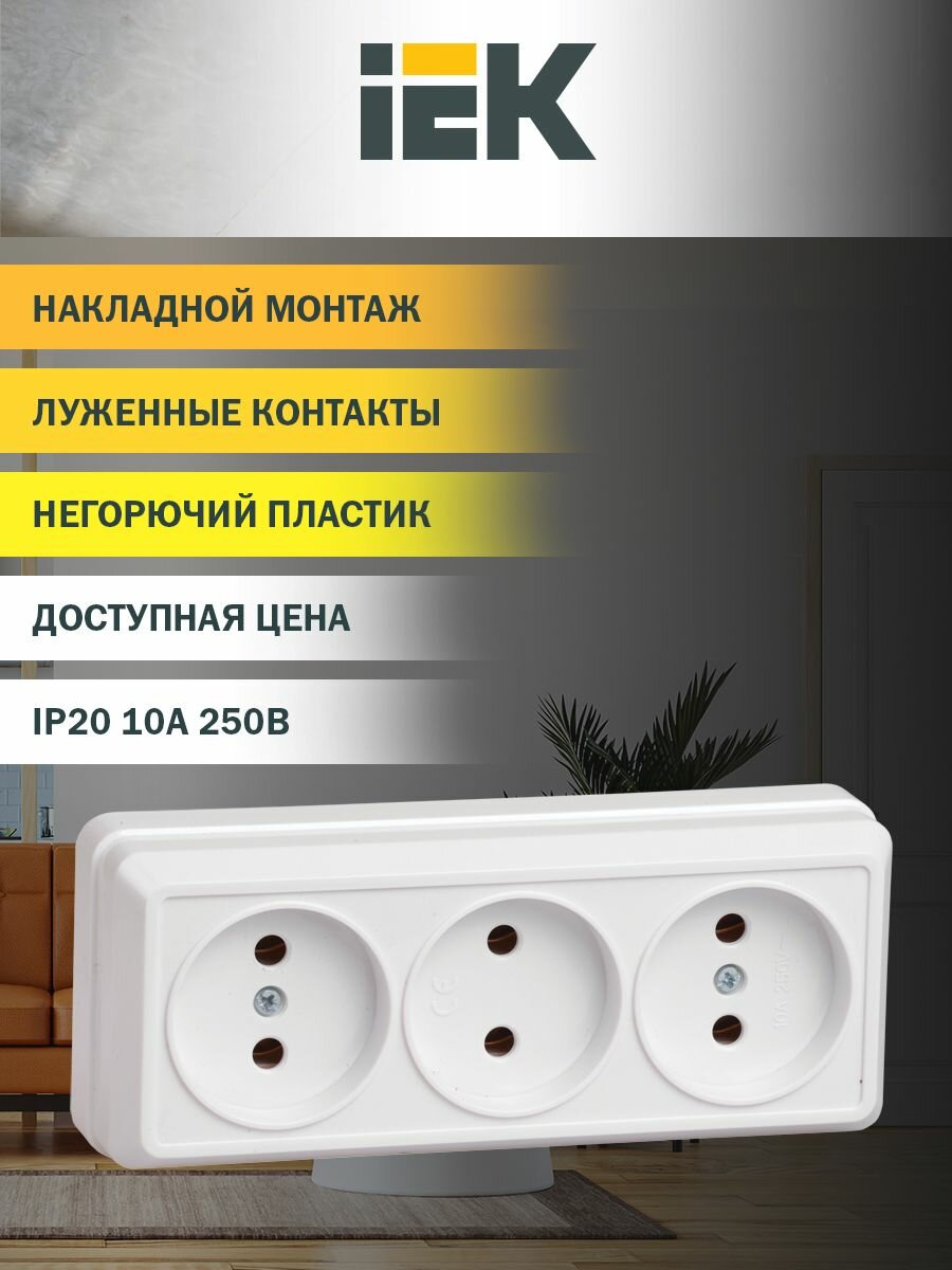 Розетка тройная накладная IEK Октава, без заземления, 10 А, 250 В, IP20, белая