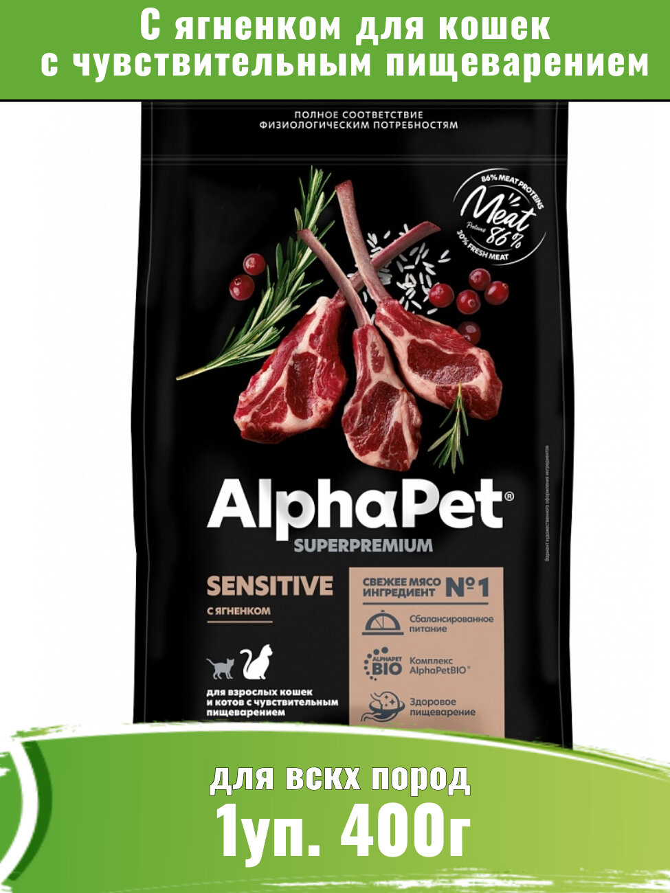 Корм для кошек AlphaPet Superpremium сухой корм для взрослых кошек с чувствительным пищеварением с Ягненком 400г