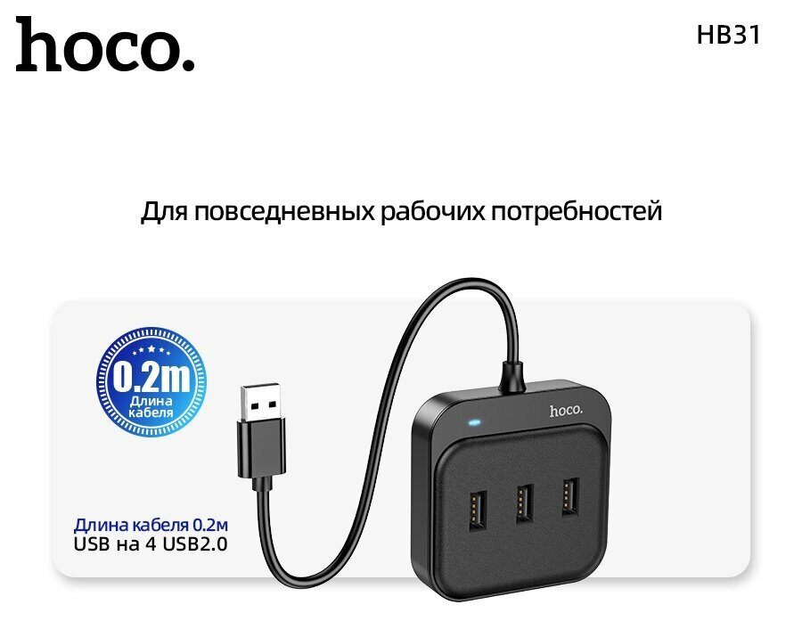 USB-концентратор HOCO HB31, Easy, 4 гнезда, кабель 1.2м, цвет: чёрный