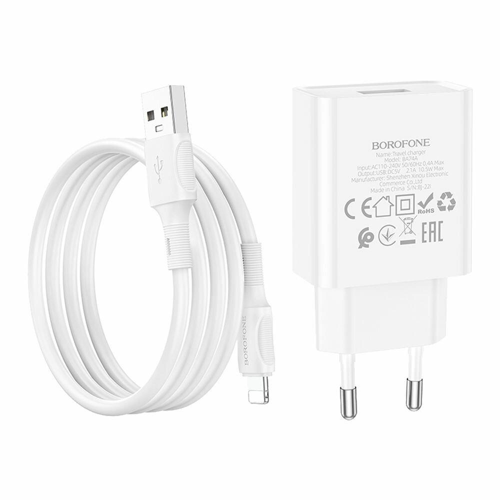 Сетевое ЗУ Borofone BA74A + кабель Lightning (1USB/2.1A) белое