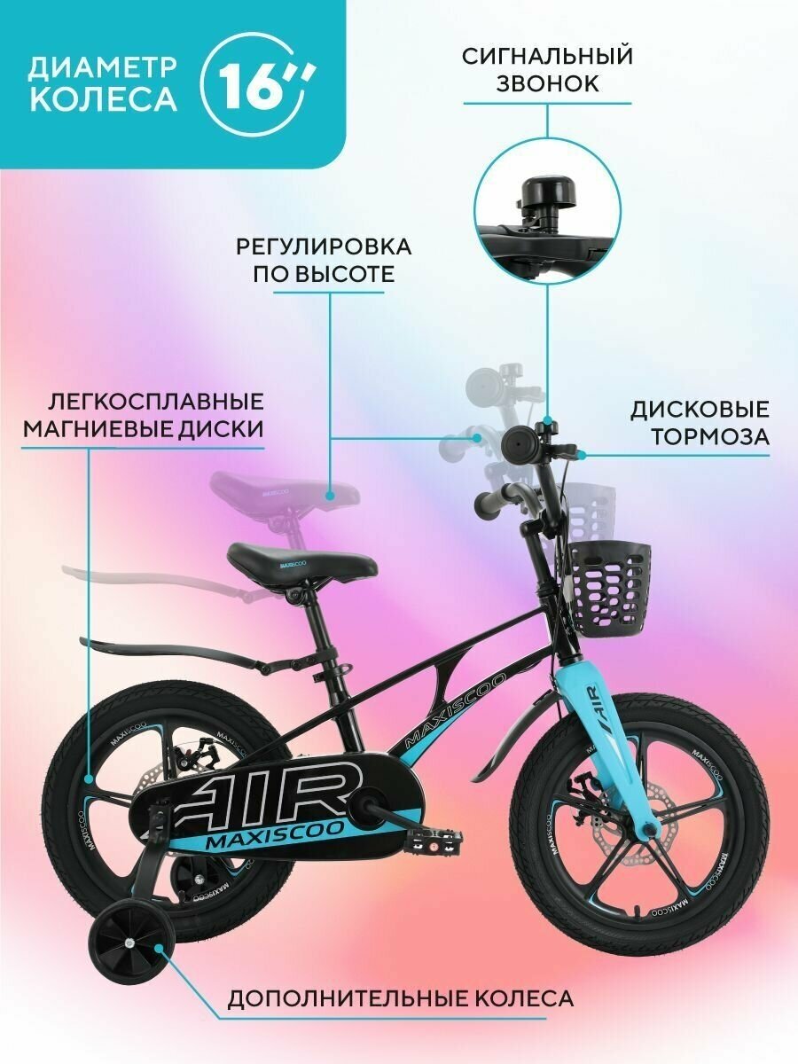 Детские велосипеды Детский Двухколесный Велосипед MAXISCOO AIR DELUXE 16 Черный, Литые Диски (2023) MSC-A1623D