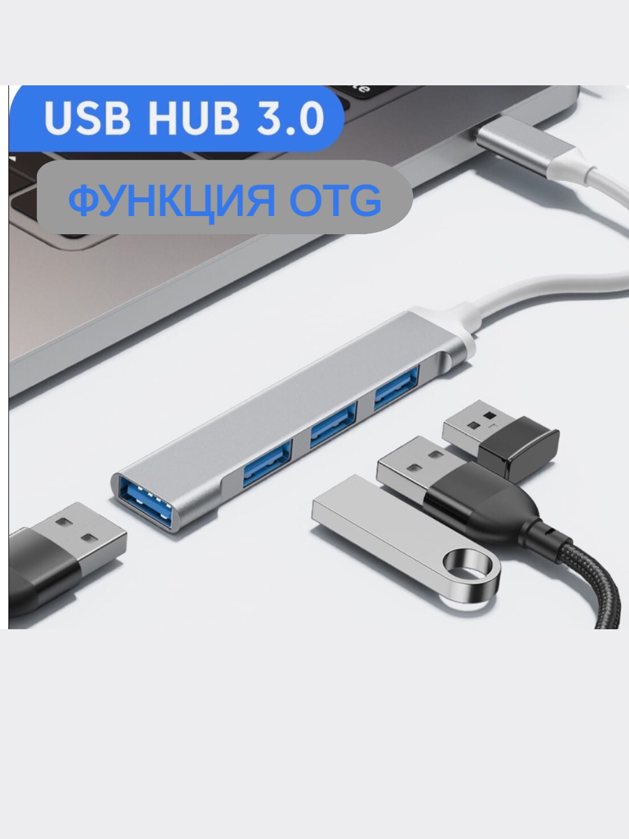 Картридеры и USB-хабы GT WARE USB HUB / разветвитель 4 в 1 Хаб / серебристый адаптер-переходник концентратор Type-C на 4 порта для телефона, macbook, ноутбук
