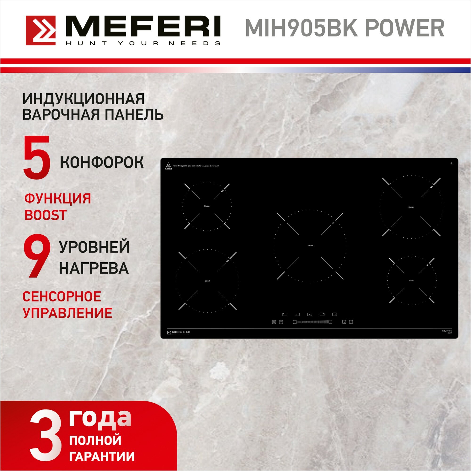 Индукционная варочная панель MEFERI MIH905BK POWER, 90 см, 5 конфорок, черная 41 990 ₽ Подробнее