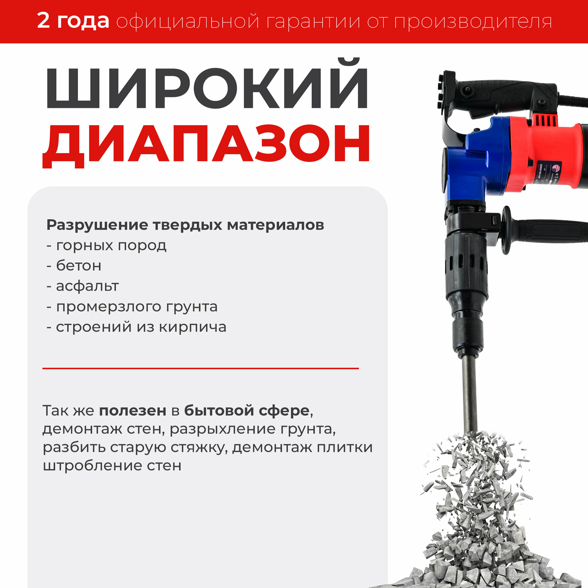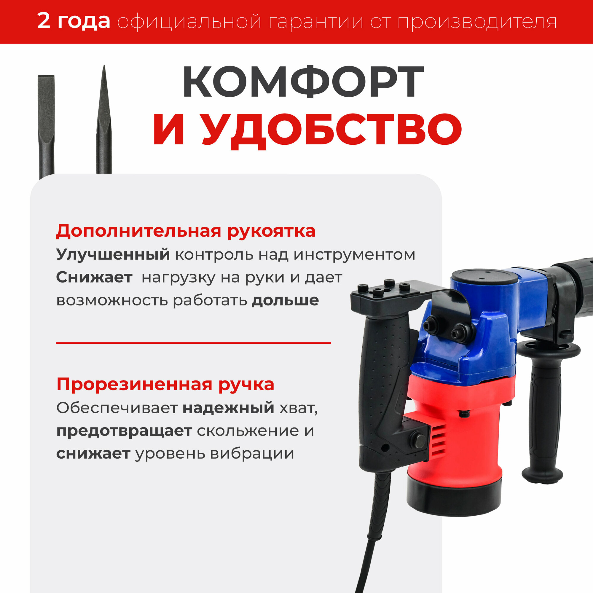 | Комплектация | дополнительная рукоятка / пика (зубило) 2 шт / кейс |