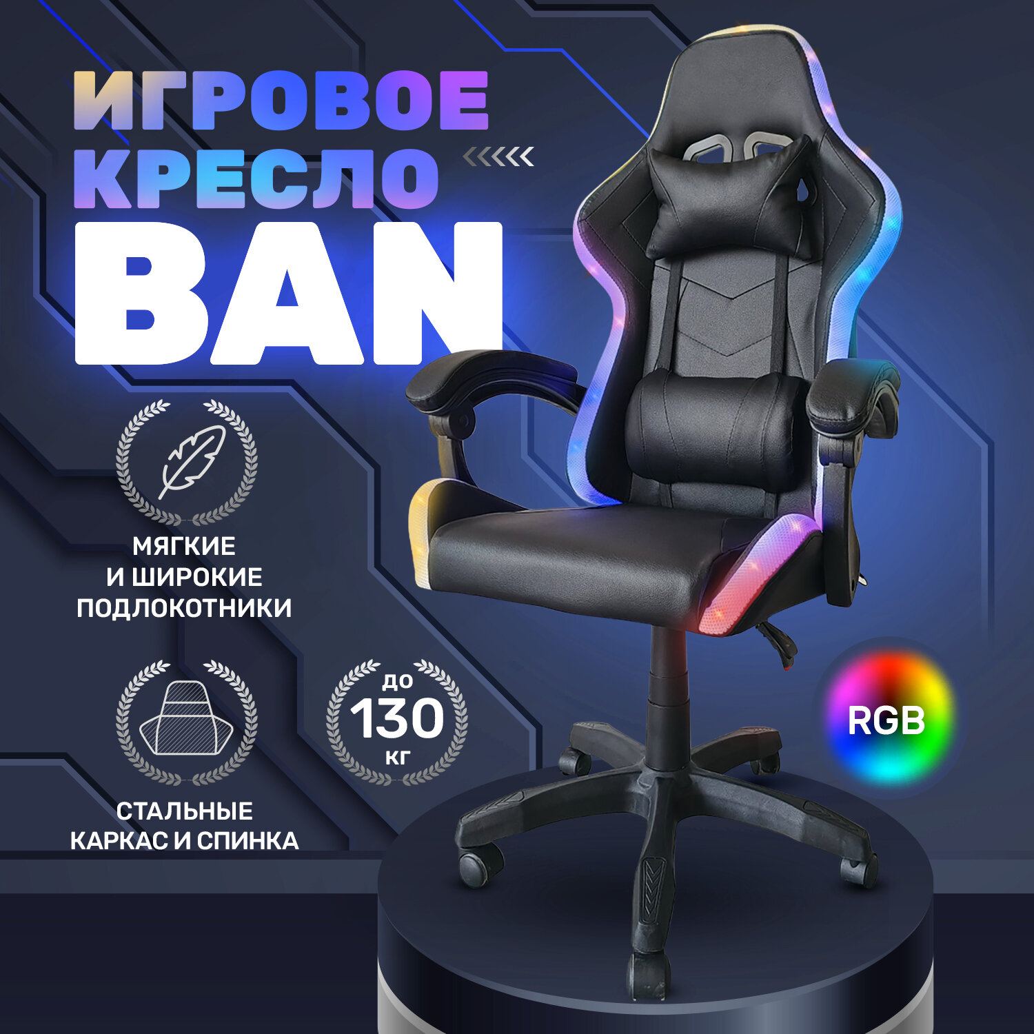 Компьютерные кресла Игровое геймерское кресло на колесиках BYROOM Game BAN RGB Black HS-5010-B-RGB кожаное крутящееся. Компьютерный стул для геймера с ортопедической высокой спинкой для игр и работы на пк