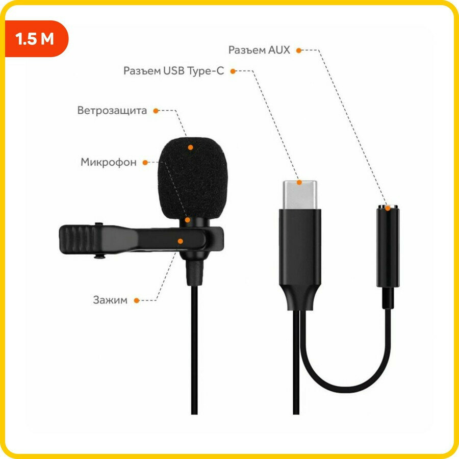 Микрофоны Петличный микрофон FaisON Mic-2 AUX 3.5 мм /Type-C, 1 м, черный