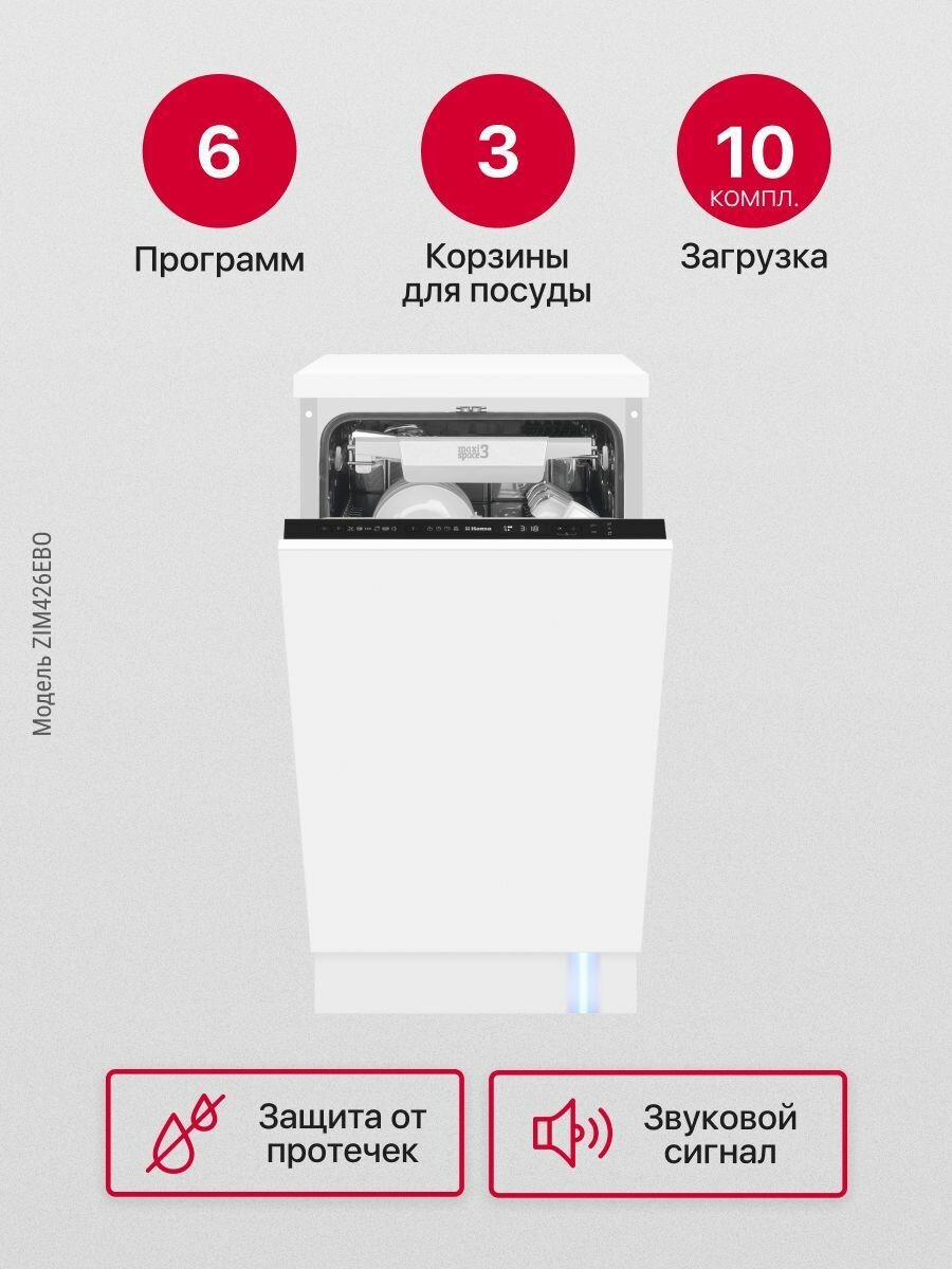 Встраиваемые посудомоечные машины Встраиваемая посудомоечная машина Hansa ZIM426EBO, 45см, автооткрывание дверцы, с защитой от протечек, 6 программ, 3 корзины, луч на полу, функция зональной мойки и отсрочка старта