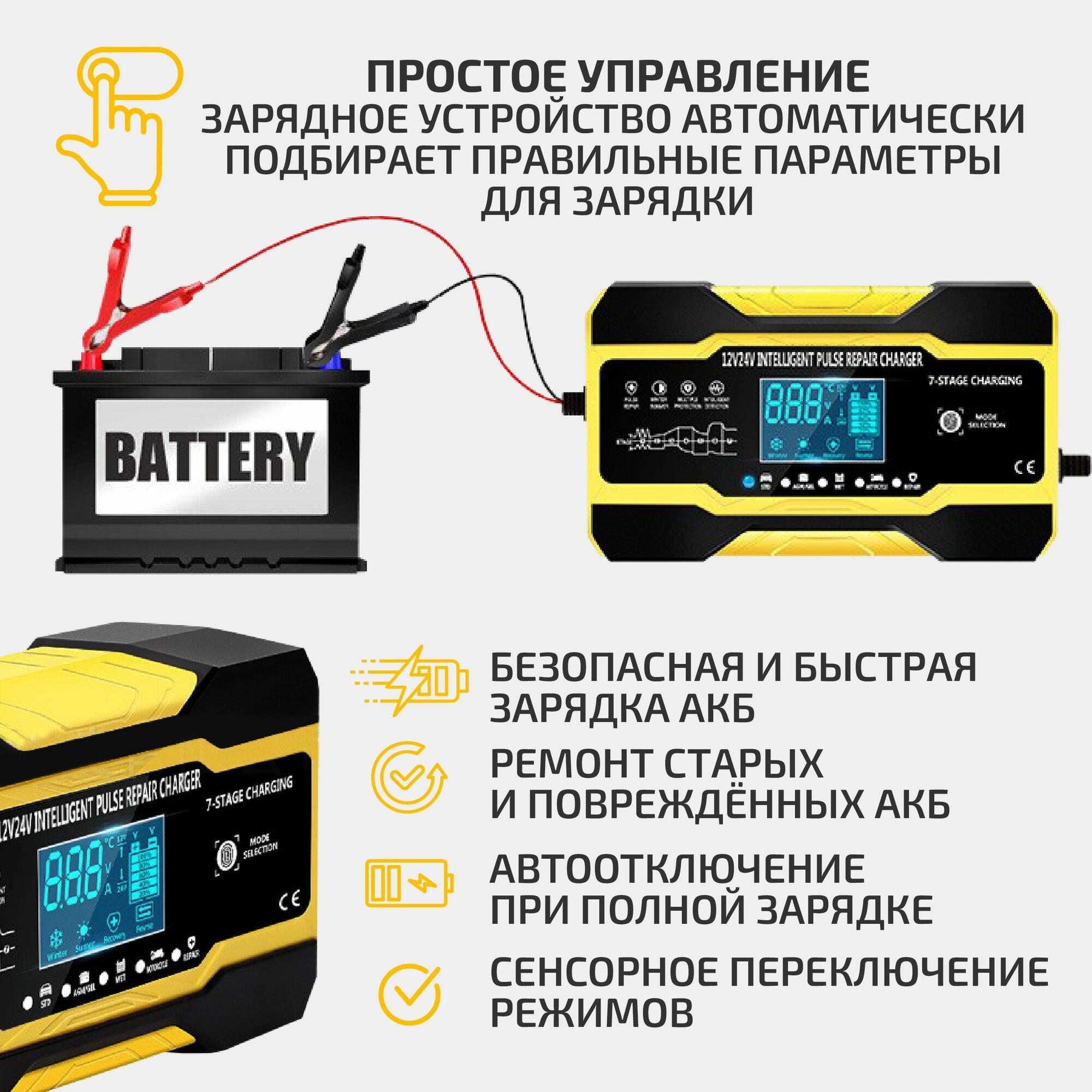 | Функции и возможности | вольтметр / индикатор зарядки / защита от перезарядки / режим зимней зарядки |