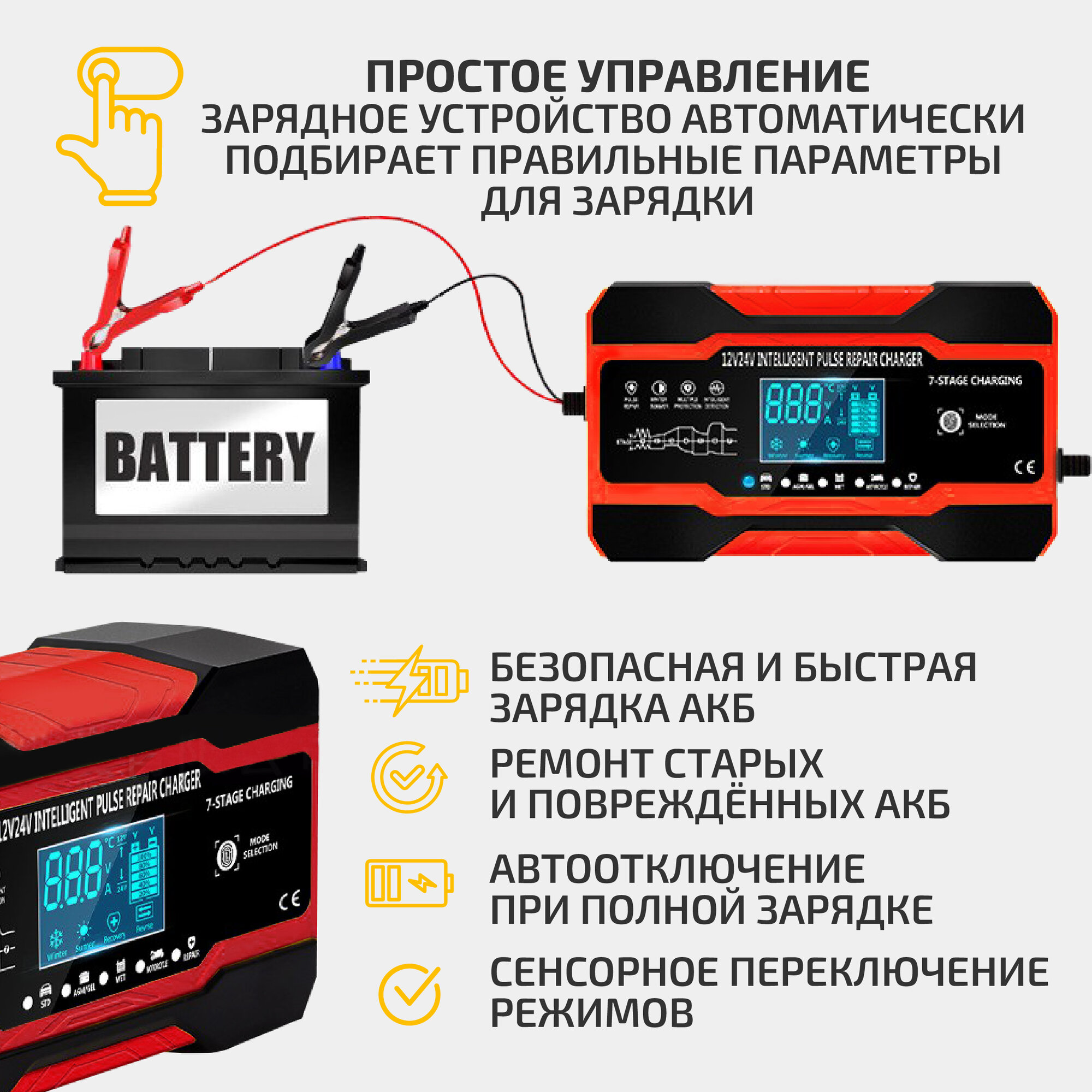 | Функции и возможности | вольтметр / индикатор зарядки / защита от перезарядки / режим зимней зарядки |