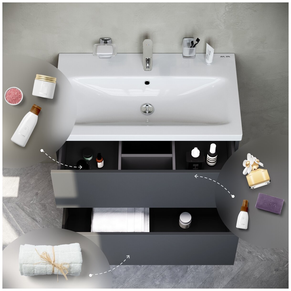 Тумба под раковину подвесная 60 см AM.PM GEM M90FHX06022GM графит, 2 ящика, под раковину в ванную, навесная, регулировка ящиков, система открывания push-to-open, эмалевое покрытие, Германия
