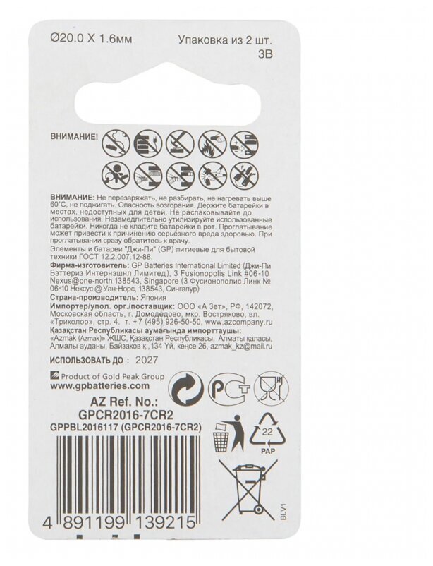 | Типоразмер | CR2016 / DL2016 / E-CR2016 / KECR2016 / 5000LC |