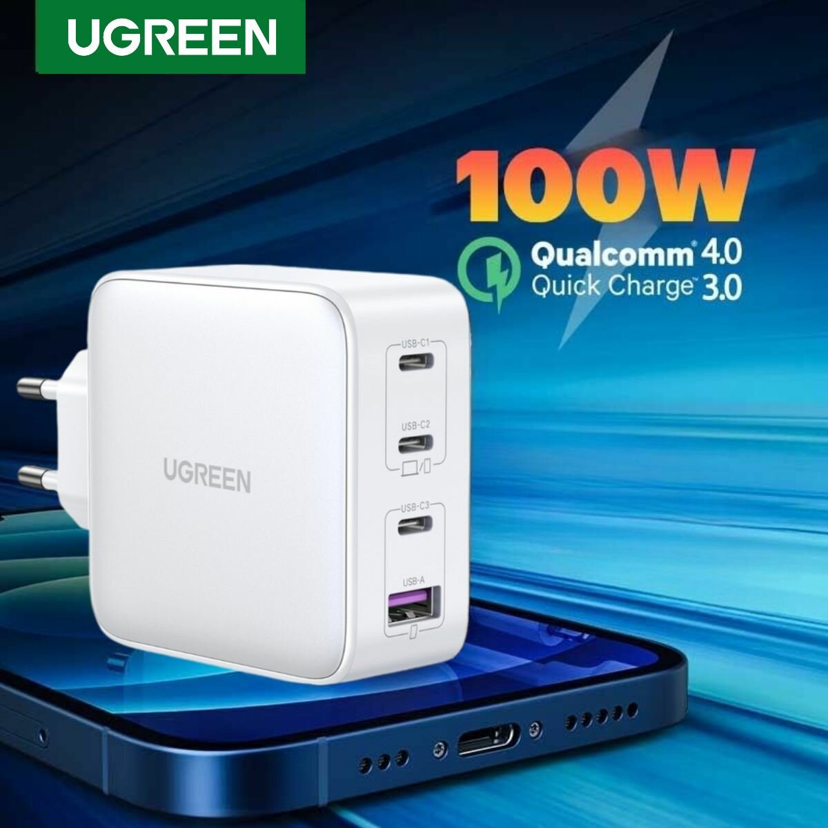 Сетевое зарядное устройство Ugreen USB-A + 3хUSB-C, 100 Вт, GaN Tech Fast Charger, черный