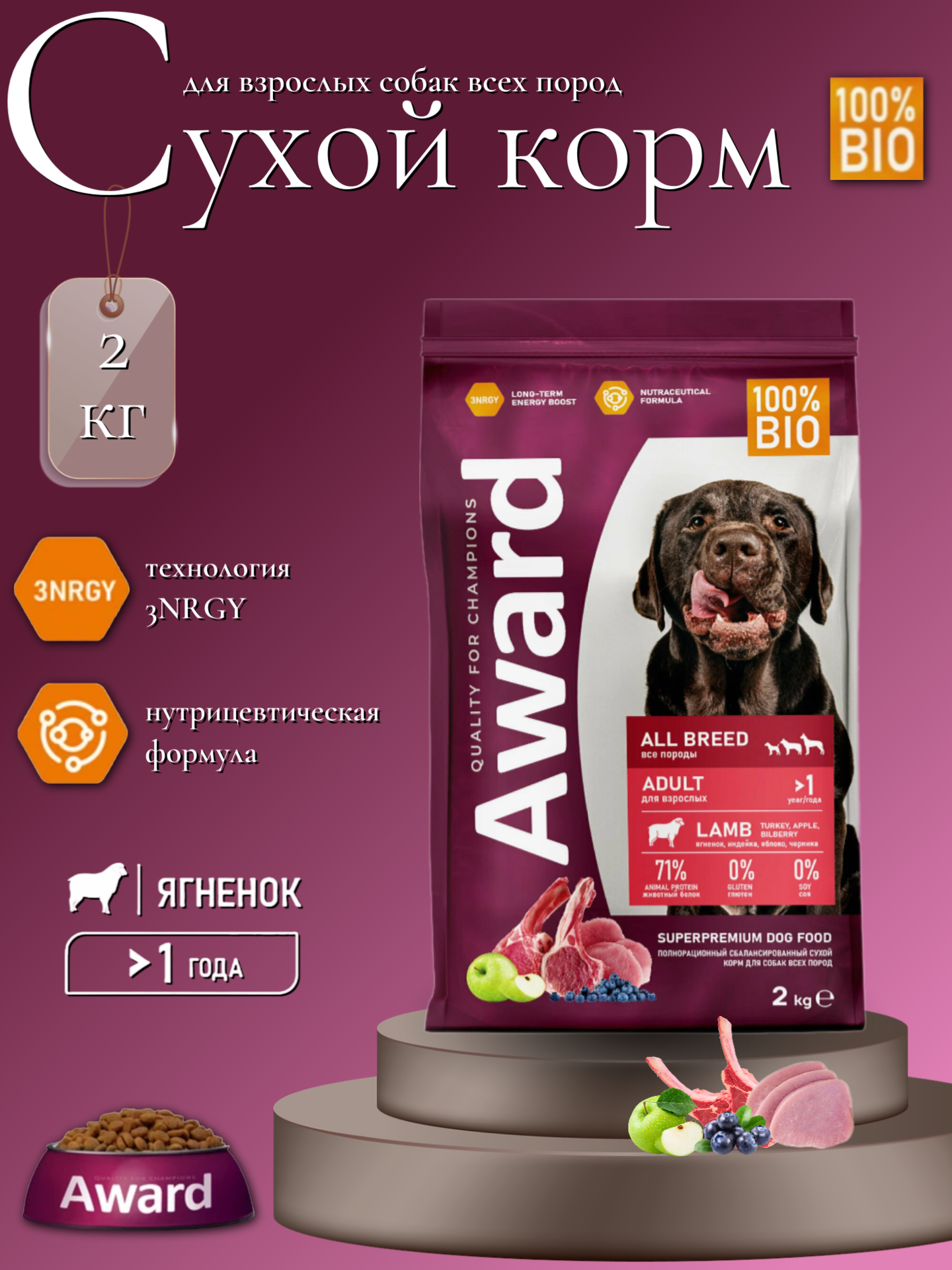 AWARD Сухой корм AWARD для взрослых собак всех пород с ягненком и индейкой с добавлением яблока и черники 2кг 7173501 2,000 кг 66733 (2 шт) 8 059 ₽ Подробнее