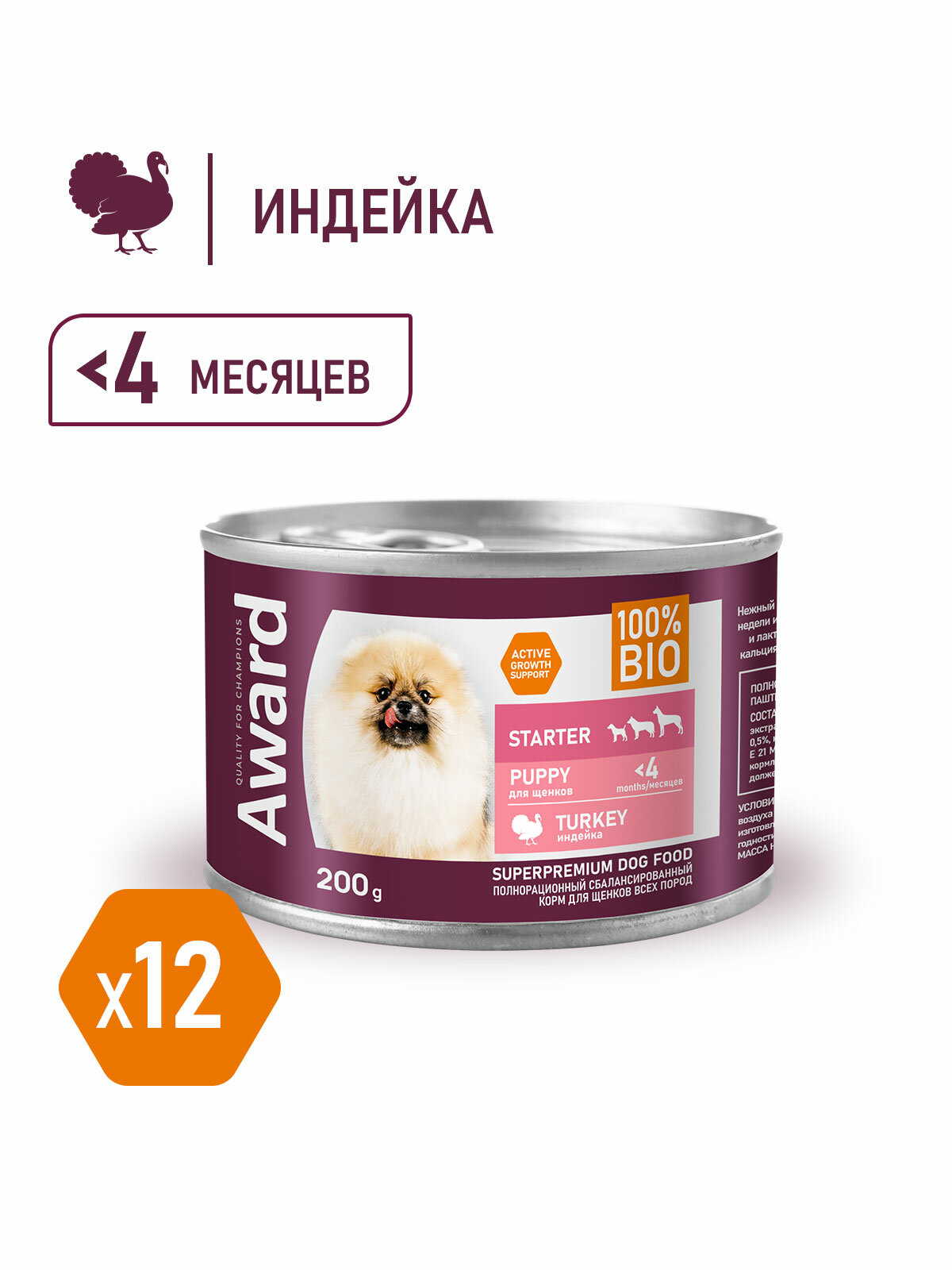 Корм для собак AWARD влажный корм для щенков с начала прикорма до 4 месяцев, беременных и кормящих сук паштет из индейки, в консервах - 200 г х 12 шт