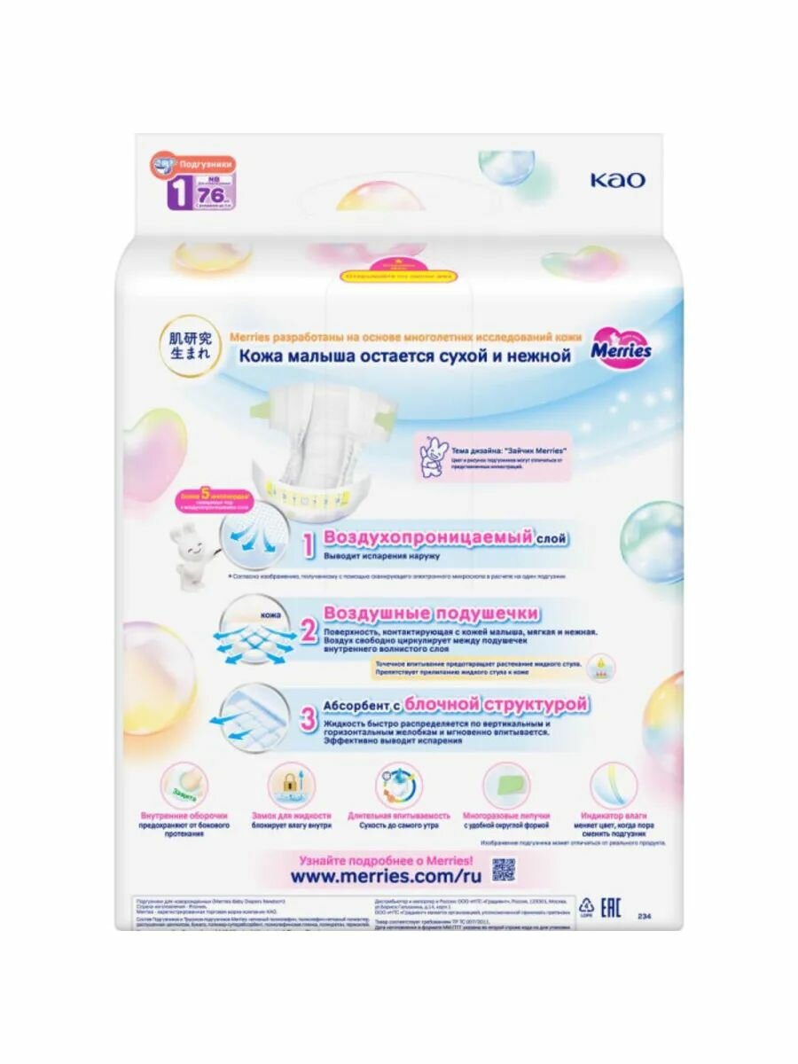 MERRIES Гипоаллергенные подгузники Merries для новорожденных, NB (0-5 кг), 90 шт