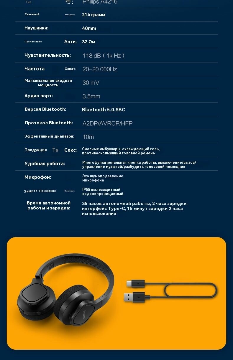 Наушники Гарнитура Philips A4216, Bluetooth, спортивная беговая шумоподавление при разговоре