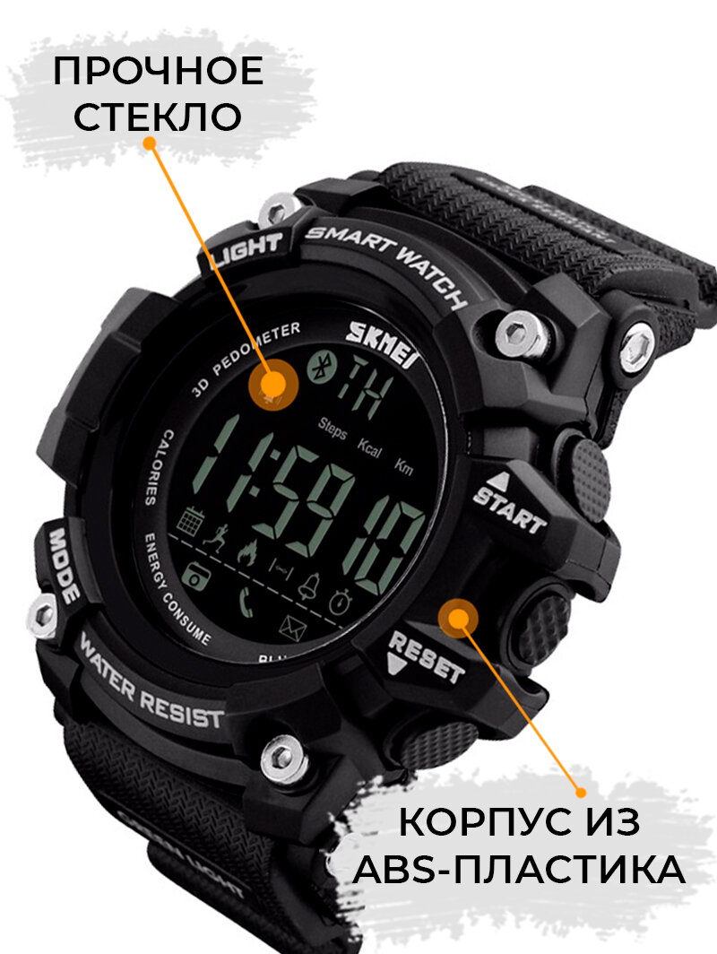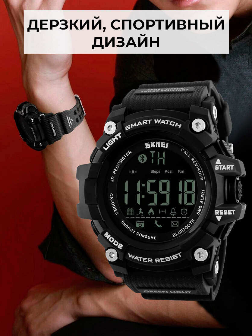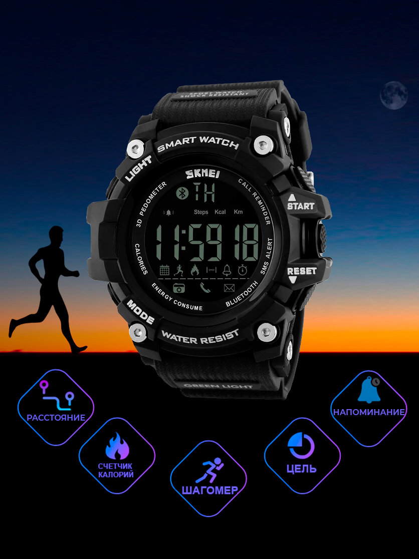 Смарт часы Часы наручные электронные спортивные мужские SKMEI кварцевые, с шагомером, будильником и секундомером, черные