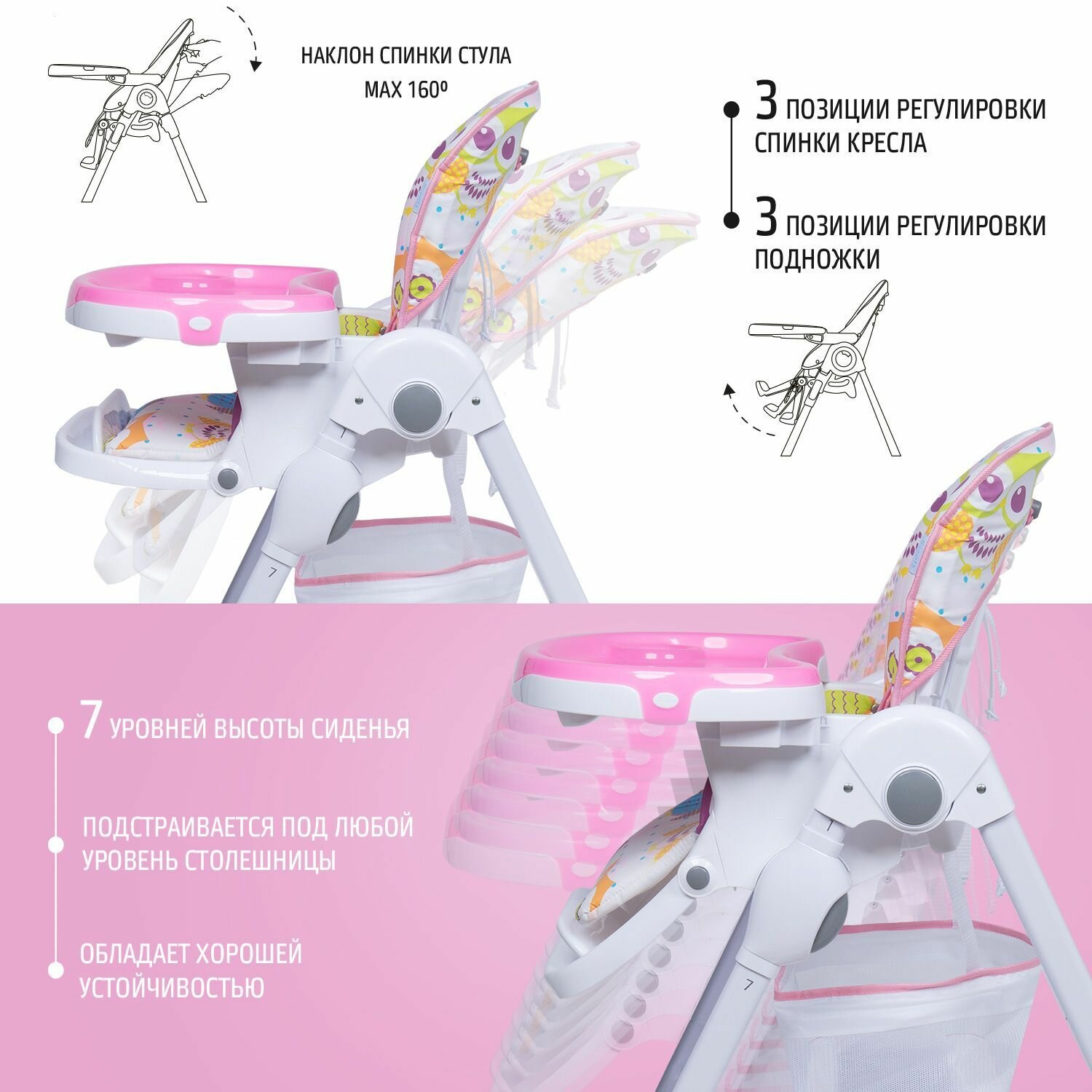 | Дополнительно | съемный столик / съемный поднос / столешница с бортиком / ремни безопасности / колеса с фиксаторами / корзина для игрушек |