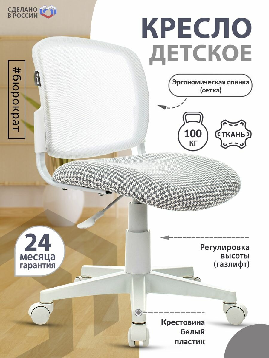 Кресло детское, серое, белое, сетка, ткань, крестовина пластик - Кресло Бюрократ компьютерное мягкое для ребенка, школьника