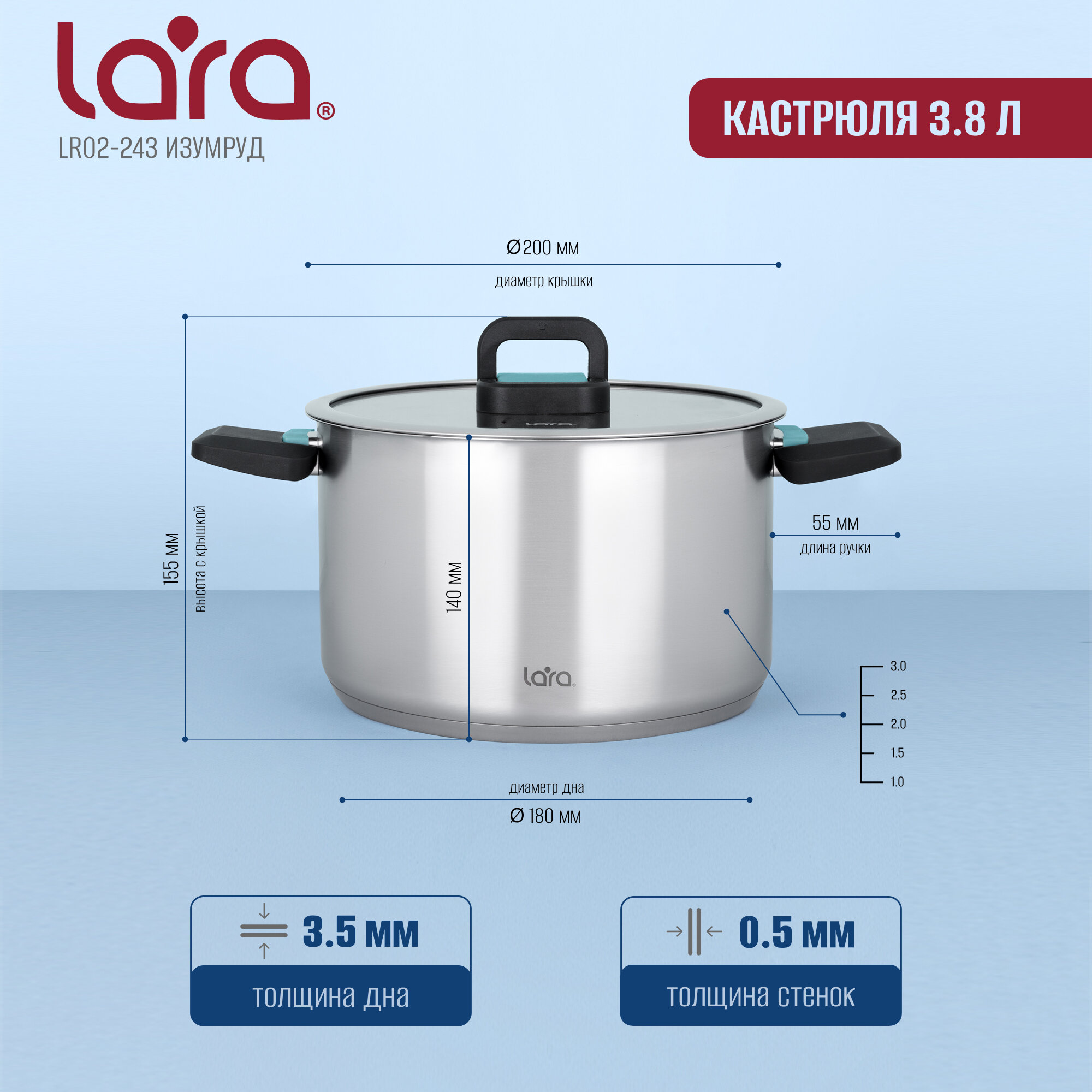 LR02-243 Кастрюля LARA (нерж) изумруд 20см, 3.8л, 5-слойное капсул. индукц. дно, складные ручки 2 999 ₽ Подробнее