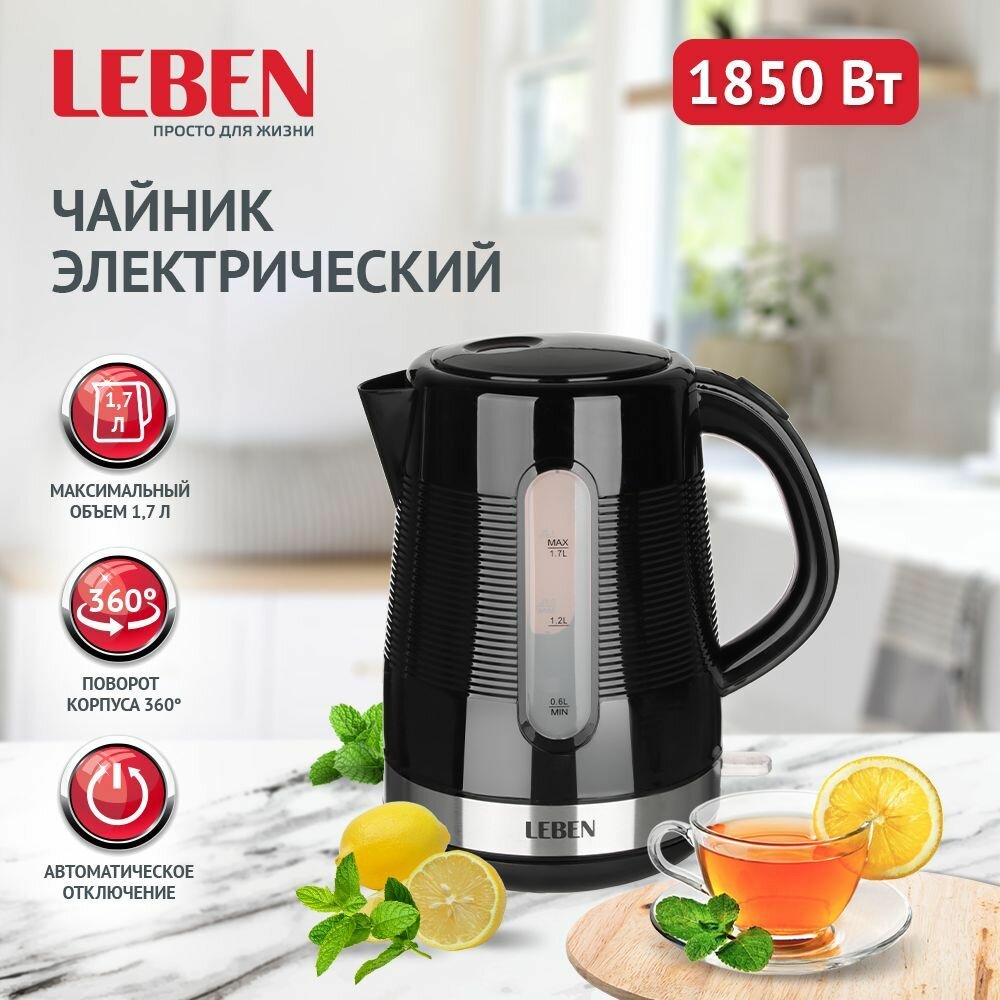 Электрочайник Чайник электрический 1,7л LEBEN, 1850Вт, скрытый нагревательный элемент, рифлёный черный пластик