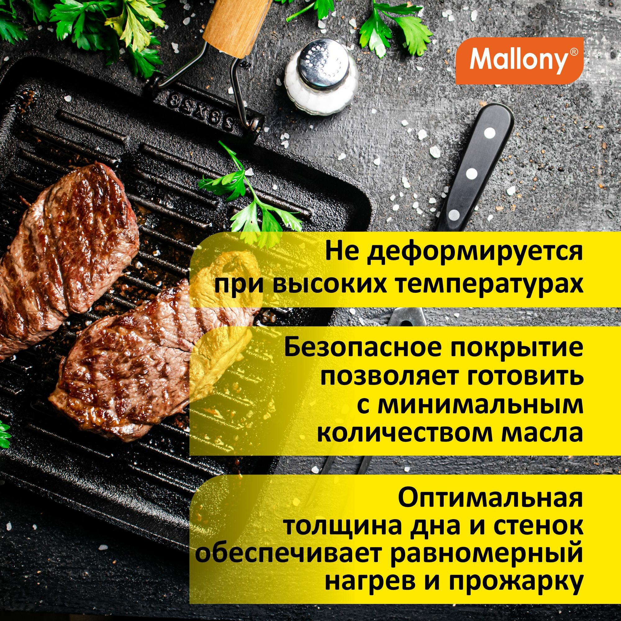 Сковорода-гриль Mallony , чугунная, с деревянной складной ручкой, 28X28 см