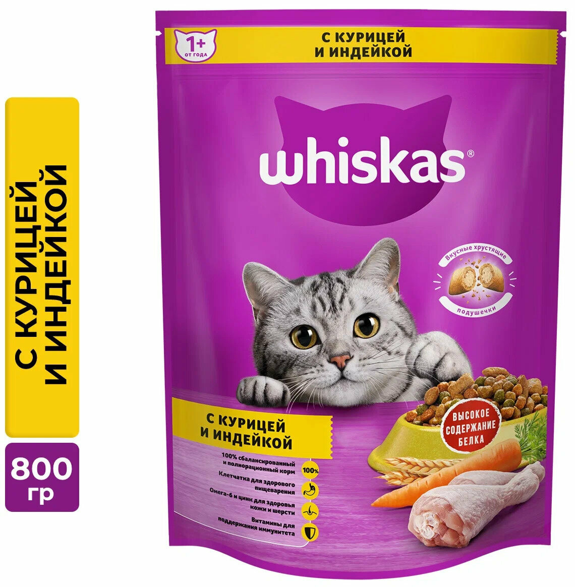 Корм сухой Whiskas для взрослых кошек, подушечки с нежным паштетом, с курицей и индейкой, 800 г