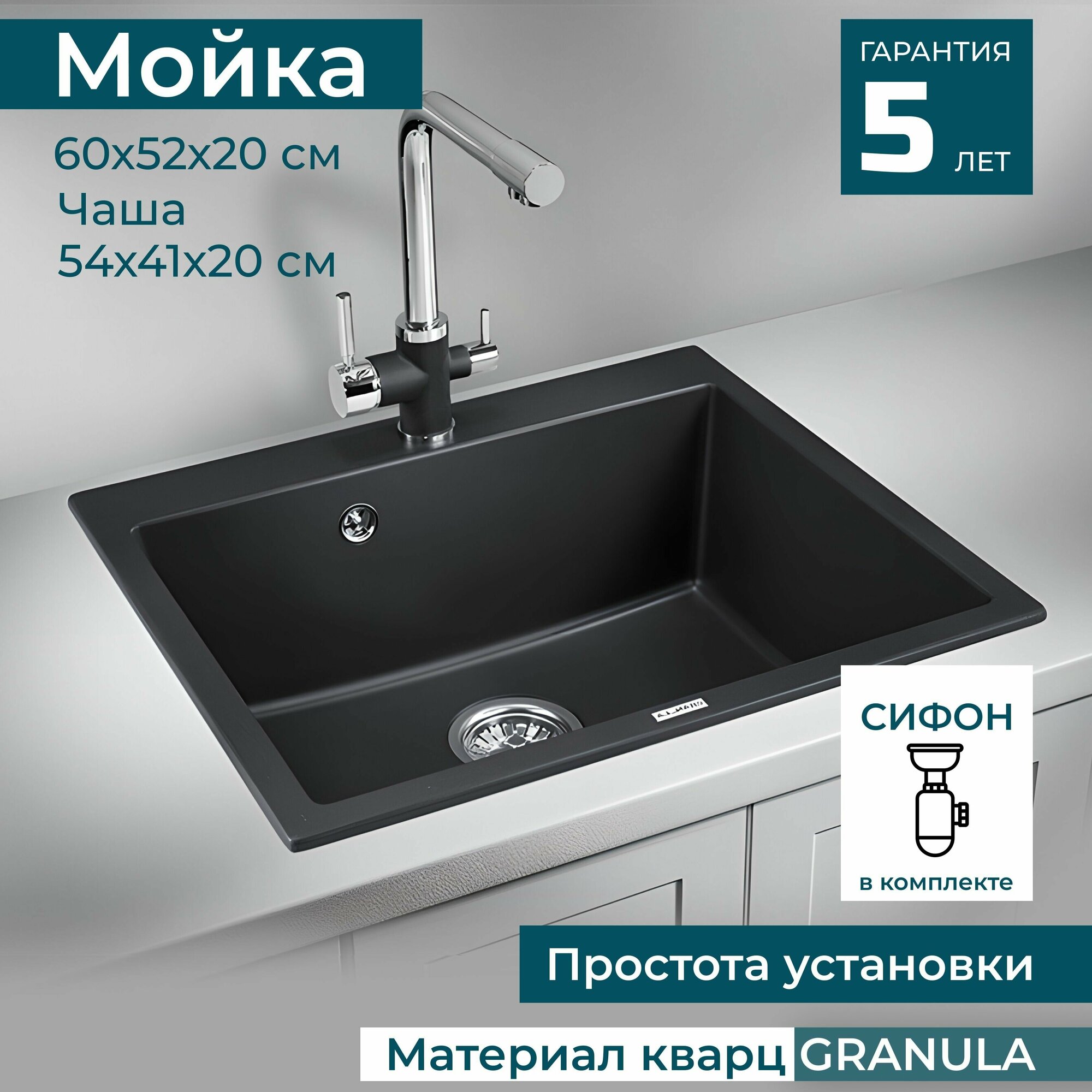 Мойка для кухни врезная кварц GRANULA 60x52x20 Кухонная раковина в комплекте с сифоном. Цвет черный металлик