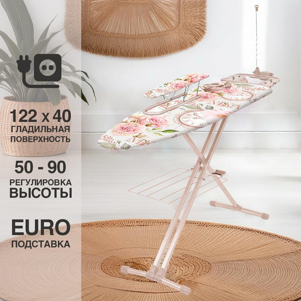 | Функции и возможности | подставка для утюга, регулировка высоты, подрукавник, полка для белья, держатель для вешалок, встроенная розетка, держатель провода |