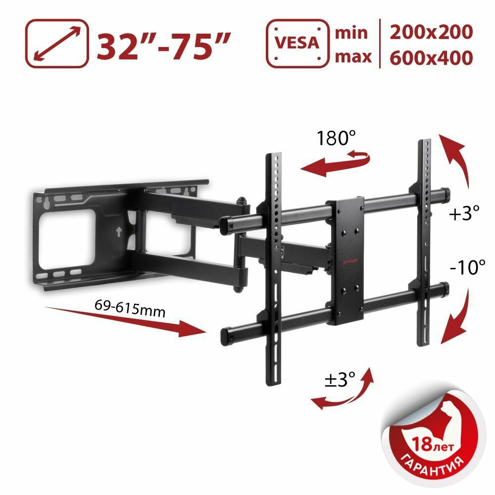 Кронштейн Arm media Paramount-60 черный, для LED/LCD TV 26"-75", max 60 кг, настенный, 5 ст свободы, от стены 69-615 мм, max VESA 600x400 мм 3 966 ₽ Подробнее