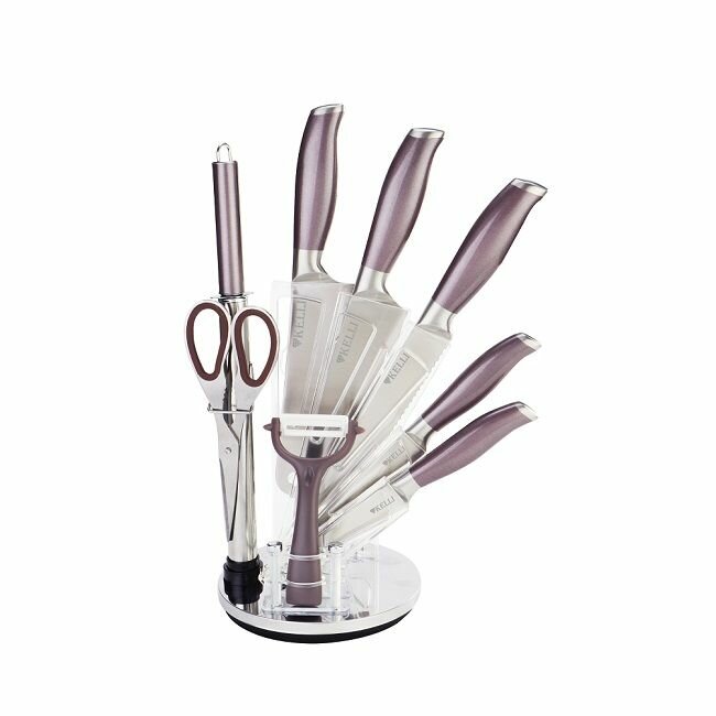 Ножи KELLI из нержавеющей стали 9 предметов на крутящейся подставке,фиолетовые ручки