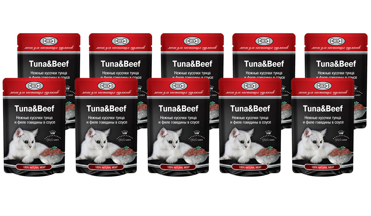 Корм для кошек GINA для взрослых кошек с тунцом и говядиной в соусе 85 гр пауч NEW 85 гр х 10 шт